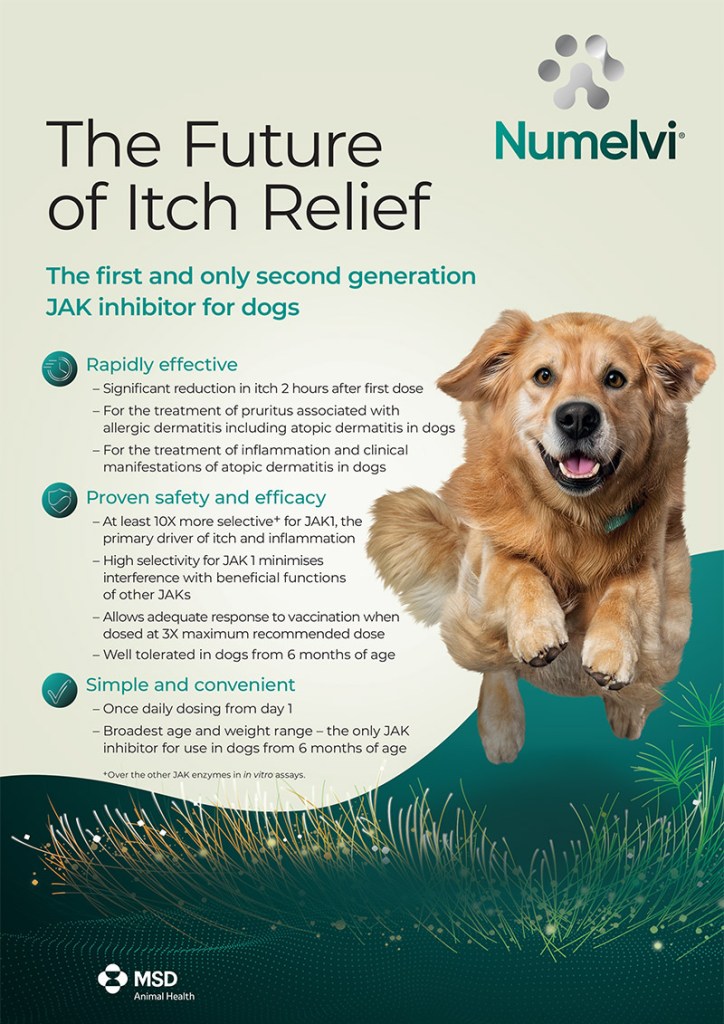 Numelvi is registered for the treatment of pruritus associated with allergic dermatitis including atopic dermatitis in dogs and for the treatment of inflammation and clinical manifestations of atopic dermatitis in dogs.
