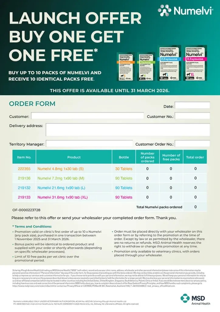 Schering-Plough Animal Health Ltd(trading as MSD Animal Health) will collect, record and use your name, phone number, postcode and email address and other information you provide in this form (“personal Information”), for only as long as is necessary for the purposes of contacting you with updates in relation to MSD Animal Health products’,unless we are required or permitted by law to hold the information for a longer period). We may disclose your personal information to organisations who assist us and our affiliated companies (which may be located in other countries including the United States, United Kingdom, Singapore, South America, Poland, China or India). If you would like to know more about our privacy policy, including how to access and seek correction of the personal information MSD holds about you, how to complain about a breach of the New Zealand Privacy Principles, and how MSD handles such complaints, please go to or to https://www.msdprivacy.com/nz/en/index.html, or contact our Privacy Officer at: Level 3, 123 Carlton Gore Road, Newmarket, Auckland, 1023, T 523 6000, msd_privacy_office@msd.com NZ-NUM-251000028